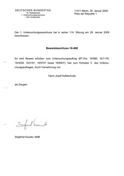 DEUTSCHER BUNDESTAG 11011 Berlin, 29. Januar 2009 16. Wahlperiode 1. Untersuchungsausschuss Platz der Republik 1 - Der Vorsitzende - Der 1. Untersuchungsausschuss hat in seiner 114. Sitzung am 29. Januar 2009 beschlossen: Beweisbeschluss 16-488 Es wird Beweis erhoben zum Untersuchungsauftrag (BT-Drs. 16/990, 16/1179, 16/3028, 16/3191, 16/5751 sowie 16/6007), hier zum Komplex V. des Untersu- chungsauftrages, durch Vernehmung von Herrn Josef Hufelschulte als Zeugen. Siegfried Kauder, MdB