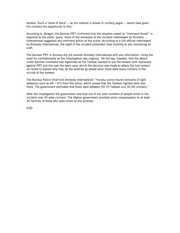 tankers. Such a "show of force" -- as the method is known in military jargon -- would have given the civilians the opportunity to flee.’ According to Spiegel, the German PRT confirmed that the situation posed an "imminent threat” in response to the pilots’ query. None of the witnesses of the incident interviewed by Amnesty International suggested any imminent action at the scene. According to a UN official interviewed by Amnesty International, the night of the incident presented clear visibility to any monitoring air craft. The German PRT in Kunduz did not provide Amnesty International with any information, citing the need for confidentiality as the investigation was ongoing. He did say, however, that the attack under German command was legitimate as the Taleban wanted to use the tankers with explosives against PRT and this was the basis upon which the decision was made to attack the fuel tankers. He failed to explain why they let the airstrike go ahead when there were many civilians in the vicinity of the tankers. The Kunduz Police Chief told Amnesty International: “Kunduz police found remnants of light weaponry such as AK – 47s from the scene, which proves that the Taleban fighters were also there. The government estimates that there were between 50-70 Taleban and 30-40 civilians.” After the investigation the government said that out of the total numbers of people killed in the incident only 30 were civilians. The Afghan government provided some compensation to at least 30 families of those who were killed by the airstrike. END