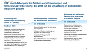 Registermodernisierung 2021 steht dabei ganz im Zeichen von Erprobungen und Umsetzungsvorbereitung; bis 2025 ist die Umsetzung in priorisierten Registern geplant Aufnahme des laufenden Betriebs und Anschluss Erprobung und Weitestgehende Umsetzung priorisierter Register Umsetzungs-vorbereitung der technischen Architektur (Proof of Concept) bis Ende 2025 bis Ende 2023 Die technische Architektur zur bis Ende 2021 Umsetzung von „Once Only“ in Wesentliche Elemente der Architektur sind umgesetzt Deutschland ist etabliert Relevante Architekturkomponenten sind erprobt und evaluiert; die Aufbau und Weiterentwicklung von Priorisierte Register folgen den Umsetzung ist vorbereitet Registern im vollen Gange etablierten Standards Modernisierungsmaßnahmen und Juristische Prüfungen sind Rechtliche Grundlagen sind klargestellt Anschlussbedingungen für Register abgeschlossen und wo nötig präzisiert sind entwickelt und kommuniziert Die Governance sorgt für einen Wesentliche Akteure einer zukünftigen Juristische Prüfungen laufen Governance sind mandatiert sicheren laufenden Betrieb Die langfristige Governance ist mit not- wendigen Handlungsfeldern hinterlegt, relevante Akteure sind einbezogen 6