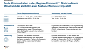 Registermodernisierung Breite Kommunikation in die „Register-Community“: Noch in diesem Monat wird das Zielbild in zwei Austauschformaten vorgestellt Forum Registermodernisierung Abstimmung mit den Ländern Datum 10. und 11. Februar 2021 (Mi und Do) 24. Februar 2021 (Mi) Jeweils von ca. 09:00 – 12:30 Uhr Von 10:00 – 12:00 Uhr Teilnehmerkre Organisation durch BMI: Organisation durch Amt für IT und Digitalisierung is ca. 150 Personen aus Bundes- und Hamburg – Senatskanzlei: Zielgruppe ist die den Landesbehören sowie IT-Dienstleister, IT-PLR vorbereitende Referentenebene in den die in die RegMo involviert sind („Register- Ländern Community“) Zielsetzung Übersicht zum aktuellen Stand der Gezielte Informationen zu den Inhalten des Registermodernisierung und assozierter Zielbilds Registermodernisierung in Vorbereitung Vorhaben herstellen, Plattform für Austausch auf die 34. Sitzung des IT-PLR am 04.03.2021 bieten und für anstehende Vorhaben bereitstellen und Raum für Fragen schaffen begeistern 7