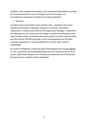 Schließlich stehen integrative Schnittstellen in die vorhandenen E-Akten-Systeme auf Seiten der Verwaltung derzeit noch nicht zur Verfügung. Auch hier sind kosten- und personalintensive Anpassungen auf Seiten der Verwaltung erforderlich. 3. Bewertung Die elektronische Kommunikation mit den Gerichten sollte – zumindest für die mit dem Gesetzentwurf adressierten Zielgruppen (Bürgerinnen und Bürger, Unternehmen, Organisationen, Verbände sowie andere am Prozessgeschehen Beteiligte) – entsprechend der Regelungen bzw. der Intention des OZG erfolgen; ein (weiterer) Sonderweg der Justiz sollte vermieden werden. Der Aufwand wäre deutlich geringer und würde zudem den Zielen des OZG sowie der SDG Rechnung tragen, da die Verwaltungsportale das Ziel haben, Leistungen übergreifend und nicht ausschließlich auf den Kanal „Justiz“ reduziert bereitzustellen. Ein Letztes: Die Möglichkeit, Zustellungen gegen Empfangsbekenntnis auch per Telekopie, d.h. Fax, vorzunehmen und Empfangsbekenntnisse auch per Telekopie an das Gericht zu senden, schafft weitere Zwänge für die Verwaltung (und insbesondere die IT Infrastruktur). Qua Gesetz wird an veralteten Ansätzen festgehalten. 5