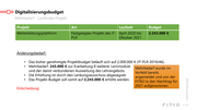 Digitalisierungsbudget Mehrbedarf - Laufendes Projekt Projekt Art Laufzeit Budget Weiterbildungsplattform Festgelegtes Projekt des IT- April 2020 bis 2.243.000 € PLR Oktober 2021 Änderungsbedarf: • Das bisher genehmigte Projektbudget beläuft sich auf 2.000.000 € (IT-PLR 2019/46). • Mehrbedarf: 243.000 € zur Erarbeitung 8 weiterer Lernmodule Mehrbedarf wurde im und der damit verbundenen Ausweitung des Lehrangebots. Vorfeld bereits • Die Erhöhung ist durch den Lenkungsausschuss abgesegnet. angemeldet und von der • Das Projekt-Budget soll somit auf 2.243.000 € erhöht werden. FITKO in den Nachtrag für Digitalisierungsbudget 2021 aufgenommen. Entscheidung: S. 14