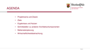 AGENDA • Projektname und Zweck • Ziele • Ergebnisse und Nutzen • Schnittstellen zu anderen Architekturkomponenten • Meilensteinplanung • Wirtschaftlichkeitsbetrachtung Folie 2
