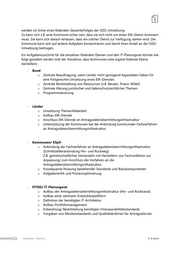 werden im Sinne eines föderalen Gesamterfolges der OZG-Umsetzung. So kann sich z.B. eine Kommune sicher sein, dass sie sich nicht um einen EfA-Dienst kümmern muss. Sie kann sich darauf verlassen, dass ein solcher Dienst zur Verfügung stehen wird. Die Kommune kann sich auf andere Aufgaben konzentrieren und damit ihren Anteil an der OZG- Umsetzung beitragen. Ein Aufgabenzuschnitt für die einzelnen föderalen Ebenen und den IT-Planungsrat könnte wie folgt gestaltet werden (mit der Annahme, dass Kommunen eine eigene föderale Ebene darstellen): - Bund o Zentrale Beauftragung, wenn Länder nicht genügend Kapazitäten haben für eine fristgerechte Umsetzung eines EfA-Dienstes o Zentrale Bereitstellung von Ressourcen (z.B. Berater, finanz. Mittel) o Zentrale Klärung juristischer und datenschutzrechtlicher Themen o Programmsteuerung - Länder o Umsetzung Themenfeldarbeit o Aufbau EfA-Dienste o Anschluss EfA-Dienste an Antragsdatenübermittlungsinfrastruktur o Unterstützung der Kommunen bei der Anbindung kommunaler Fachverfahren an Antragsdatenübermittlungsinfrastruktur - Kommunen/ KSpV o Anbindung der Fachverfahren an Antragsdatenübermittlungsinfrastruktur (Schnittstellenanbindung Hin- und Rückweg) Z.B. gemeinschaftliches Verhandeln mit Herstellern von Fachverfahren zur Anpassung/ zum Anschluss der Verfahren an die Antragsdatenübermittlungsinfrastruktur o Konsequente Nutzung bestehender Standards und Basiskomponenten o Aufgabenkritik und Prozessoptimierung - FITKO/ IT-Planungsrat o Aufbau der Antragsdatenübermittlungsinfrastruktur (Hin- und Rückkanal) o Aufbau einer zentralen Entwicklerplattform o Definition der benötigten IT-Architektur o Aufbau Portfoliomanagement o Entwicklung/ Bereitstellung benötigter Interoperabilitätsstandards o Vorgaben von Mindeststandards und Qualitätskriterien für Antragsdienste Bearbeiter [Datum] S. 4 von 6