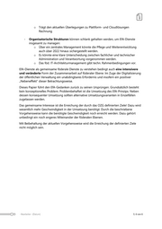 o Trägt den aktuellen Überlegungen zu Plattform- und Cloudlösungen Rechnung - Organisatorische Strukturen können schlank gehalten werden, um EfA-Dienste insgesamt zu managen: o Über ein zentrales Management könnte die Pflege und Weiterentwicklung auch über 2022 hinaus sichergestellt werden. o Es könnte eine klare Unterscheidung zwischen fachlicher und technischer Administration und Verantwortung vorgenommen werden. o Das föd. IT-Architekturmanagement gibt techn. Rahmenbedingungen vor. EfA-Dienste als gemeinsame föderale Dienste zu verstehen bedingt auch eine intensivere und veränderte Form der Zusammenarbeit auf föderaler Ebene. Im Zuge der Digitalisierung der öffentlichen Verwaltung ein unabdingbares Erfordernis und insofern ein positiver „Nebeneffekt“ dieser Betrachtungsweise. Dieses Papier führt den EfA-Gedanken zurück zu seinen Ursprüngen. Grundsätzlich besteht kein konzeptionelles Problem. Problembehaftet ist die Umsetzung des EfA-Prinzips. Neben dessen konsequenter Umsetzung sollten alternative Umsetzungsvarianten in Einzelfällen zugelassen werden. Das gemeinsame Interesse ist die Erreichung der durch das OZG definierten Ziele! Dazu wird wesentlich mehr Geschwindigkeit in der Umsetzung benötigt. Durch die beschriebene Vorgehensweise kann die benötigte Geschwindigkeit noch erreicht werden. Dazu gehört unbedingt ein noch engeres Miteinander der föderalen Ebenen. Mit Beibehaltung der aktuellen Vorgehensweise wird die Erreichung der definierten Ziele nicht möglich sein. Bearbeiter [Datum] S. 6 von 6