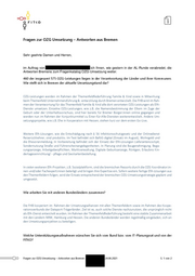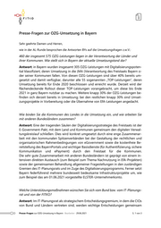 Presse-Fragen zur OZG-Umsetzung in Bayern Sehr geehrte Damen und Herren, wie in der AL-Runde besprochen die Antworten BYs auf die Umsetzungsfragen z.w.V.: 460 der insgesamt 575 OZG-Leistungen liegen in der Verantwortung der Länder und ihrer Kommunen. Wie stellt sich in Bayern der aktuelle Umsetzungstand dar? Antwort: in Bayern wurden insgesamt 305 OZG-Leistungen mit Digitalisierungspoten- tial klassifiziert, deren Umsetzung in die (Mit-)Verantwortung des Freistaats Bayern o- der seiner Kommunen fallen. Von diesen OZG-Leistungen sind über 40% bereits um- gesetzt und damit verfügbar, darunter alle 55 sogenannten „TOP-Leistungen“, deren Umsetzung bereits für Ende 2020 beschlossen und erreicht wurde. Derzeit wird der flächendeckende Rollout dieser TOP-Leistungen vorangebracht, um diese bis Ende 2021 in ganz Bayern nutzbar zu machen. Weitere knapp 30% der OZG-Leistungen be- finden sich derzeit bereits in Umsetzung; bei den restlichen knapp 30% sind Umset- zungsprojekte in Vorbereitung oder die Übernahme von EfA-Leistungen angedacht. Wie binden Sie die Kommunen des Landes in die Umsetzung ein, und wie arbeiten Sie mit anderen Bundesländern zusammen? Antwort: Eine der tragenden Säulen der Digitalisierungsstrategie des Freistaats ist der E-Government-Pakt, mit dem Land und Kommunen gemeinsam den digitalen Verwal- tungskreislauf schließen. Dies wird konkret umgesetzt durch eine enge Zusammenar- beit mit den kommunalen Spitzenverbänden bei der Gestaltung der rechtlichen und organisatorischen Rahmenbedingungen von eGovernment sowie die kostenfreie Be- reitstellung des BayernPortals und wichtiger Basisdienste (für Authentifizierung, sichere Kommunikation und ePayment) durch den Freistaat für die Kommunen. Die sehr gute Zusammenarbeit mit anderen Bundesländern ist geprägt von einem in- tensiven direkten Austausch (zum Beispiel zum Thema Nachnutzung in EfA-Projekten) sowie der gemeinsamen Behandlung allgemeiner Fragestellungen in den zuständigen Gremien des IT-Planungsrats und im Zuge des Digitalisierungsprogramms. Ferner setzt Bayern federführend mehrere bundesweit bedeutsame Infrastrukturprojekte um, wie zum Beispiel das am 01.06.2021 vorgestellte ELSTER-Unternehmerkonto. Welche Unterstützungsmaßnahmen wünschen Sie sich vom Bund bzw. vom IT-Planungs- rat und von der FITKO? Antwort: Im IT-Planungsrat als strategischem Entscheidungsgremium, in dem die CIOs von Bund und Ländern vertreten sind, werden wichtige Entscheidungen gemeinsam Presse-Fragen zur OZG-Umsetzung in Bayern Bearbeiter 29.06.2021 S. 1 von 3