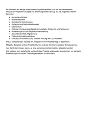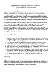 Er sollte sich auf wenige reale Anwendungsfälle beziehen und aus den bestehenden Blockchain-Projekten Konzepte und Erfahrungswerte in Bezug auf z.B. folgende Kriterien bewerten: Nutzerfreundlichkeit Wirtschaftlichkeit ökologische Auswirkungen Sicherheit und Nachvollziehbarkeit Datenschutz Rolle der Vertrauenswürdigkeit der beteiligten Endpunkte und Netzwerke Auswirkungen auf die Registermodernisierung Zukunftssicherheit (Migrationen) Föderale Architekturrichtlinien Einfluss auf Architektur und zeitliche Planung der OZG-Projekte Die zu betrachtenden Aspekte der Analysen sind im Projektantrag zu detaillieren. Mögliche Beispiele sind die Projekte iDUnion und das Verifizieren digitaler Schulzeugnisse. Aus den Erkenntnissen kann u.a. eine gemeinsame Zielarchitektur abgeleitet werden. Ziel sollte es sein, bestehende und zukünftige Projekte aufeinander abzustimmen, um parallele Entwicklungen mit neuen Technologieansätzen zu verhindern.