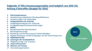 Folgende 17 EfA-Umsetzungsprojekte sind lediglich von SDG VO, Anhang Il betroffen (Budget für SDG) 1. Fahrerlaubniswesen 2. Anerkennung ausländischer Berufsqualifikationen 3. Anerkennungen und Zulassungen 4. Anlagenbetrieb und -prüfung 5. Anlagengenehmigung und -zulassung 6. Anzeigepflichtige Personalveränderungen 7. BAföG 8. Basiskomponente Nachweisabruf 9. Berufsregisterauszüge SDG II 10. Bestellung und Anerkennung von Sachverständigen 5 11. Digitale Nachweise und Berechtigungen auf der Hochschuljourney 12. KONSENS/ELSTER OZG Leistungen 13. Leistungen der Sozialplattform 14. Tätigkeitsanzeige und -erlaubnis 15. Unternehmensstart 16. Wohnen und Umzug 5 17. Veranstaltungserlaubnis
