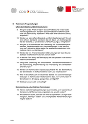 B. Technische Fragestellungen Offene Schnittstellen und Betriebsstrukturen 9. Wie groß ist der Anteil der Open-Source Produkte und werden OZG- Verwaltungsleistungen als Open Source-Produkte mit offenem Quell- code zur Nachnutzung angeboten? Wird dabei eine lizenzfreie Lösung angestrebt? 10. Werden vor allem offene Standards und Schnittstellen genutzt? An wel- chen offenen Standards orientieren Sie sich dabei, um die Interoperabi- lität der Systeme zu gewährleisten und Nachnutzung zu ermöglichen? 11. Wie geht ihr Bundesland bei der Entwicklung von Schnittstellenspezifi- kationen, Betriebsmodellen und Lizenzbedingungen für die Nachnut- zung vor? Auf welche Weise stellen Sie anderen Bundesländern Infor- mationen hierzu zur Verfügung? 12. Werden die von ihnen entwickelten OZG-Leistungen als Open Source- Software veröffentlicht? Falls nein, warum nicht? 13. In welcher Form erfolgt die Übertragung der Antragsdaten in die kommu- nalen Fachverfahren? 14. Erfolgt eine Einbindung der verschiedenen Fachverfahrenshersteller in die Ausarbeitung, Implementierung und Finanzierung der Schnittstellen- anforderungen? 15. Werden die kommunalen Anpassungsaufwände für die Bereitstellung der Schnittstellen in die Fachverfahren vom Land (mit)finanziert? 16. Wird im Einzelfall auch ein dezentraler Betrieb von OZG-Verwaltungs- leistungen in kommunalen Rechenzentren bzw. bei kommunalen IT- Dienstleistern in Erwägung gezogen bzw. ermöglicht? 17. Welches Lizenzmodell wird verfolgt? Berücksichtigung zukunftsfähiger Technologien 18. Können OZG-Verwaltungsleistungen auch modular, z.B. basierend auf Containern und Microservices, angeboten und genutzt werden? 19. Wie stellen Sie sicher, dass die von ihnen ausgewählten Lösungen tech- nologisch „lebendig“ bleiben und unkomplizierte Weiterentwicklungen möglich bleiben? SEITE 2