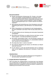 Benutzerfreundlichkeit 20. Werden die gesetzlichen Anforderungen (EU-, Bundes- und Landes- recht) an die Usability und Barrierefreiheit der umgesetzten Online- Dienste durchgehend erfüllt? Werden insbesondere Leistungen für Bür- ger auch in einer einfachen Sprache angeboten? Werden die digitali- sierten Verwaltungsleistungen auch in anderen Sprachen als Deutsch angeboten? 21. Wie funktioniert die Authentifizierung in ihrem Bundesland und wie die Weiterleitung des Nutzers zu dem EfA-Dienst in ein anderes Bundes- land? 22. Wäre in Deutschland nur ein Nutzerkonto für alle Verwaltungsleistun- gen nicht vorteilhafter für die Nutzer? Wenn Sie das anders sehen, wa- rum? 23. Auf welche Weise wird eine Anbindung der kommunalen Nutzerkonten sichergestellt? 24. Wie erkennt der EfA-Dienst von welcher Kommune die Nutzer auf den Dienst zugreifen, um die Benutzeroberfläche anzupassen? 25. Wie werden unterschiedliche Daten in den EfA-Diensten hinterlegt und je nach Anforderung korrekt abgerufen (z. B. unterschiedliche Gebühren oder Parameter wie Containergrößen)? 26. Wer pflegt diese Daten in welchen Intervallen? 27. Wie erfolgt die Weiterleitung des Nutzers vom EfA-Dienst zum Bezahl- dienst der Kommune? 28. Für den Zeitraum, in dem das Vermittlungssystem nicht zur Verfügung steht, ist eine tragfähige Interimslösung zu vereinbaren. Existiert eine solche? Datenübermittlung 29. Wie und in welcher Form erfolgt die Übertragung der Antragsdaten in die kommunalen Fachverfahren und zurück? C. (Vergabe-)Rechtliche Fragestellungen Offen sind bislang die vergaberechtlichen Voraussetzungen einer Bereitstel- lung und Mitnutzung von EfA-Diensten durch die Kommunen. Nicht alle Bun- desländer planen eine unentgeltliche und damit grundsätzlich vergabefreie Be- reitstellung der EfA-Dienste für die Kommunen. SEITE 3