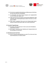 30. Wie wird eine vergabefreie Bereitstellung und Mitnutzung von EfA-Diens- ten durch die Kommunen sichergestellt? 31. Ist sichergestellt, dass Open Source-Lösungen auch vergaberechtlich und ohne Hindernisse möglich sind? 32. Haben die Kommunen die rechtliche (und technische) Möglichkeit, selbst entwickelte OZG-Verwaltungsleistungen anderen Kommunen zur Verfü- gung zu stellen? 33. (Wie) werden europäische Start-ups bei der Auftragsvergabe berück- sichtigt und welche Erfahrungen haben Sie mit Start-ups gemacht? D. Finanzielle Fragestellungen 34. Wer steuert, dass die Kommunen in ihrem Land an die Onlinedienste angeschlossen werden? 35. Wie erfolgen Finanzierung bzw. Bezahlung bei Inanspruchnahme der EfA-Leistungen für Kommunen? E. Unterstützung durch den Bund 36. Gibt es Unterstützungsmöglichkeiten aus dem BT, die Ihnen bei ihrem OZG-Pflichtenheft vor Ort helfen würden? SEITE 4