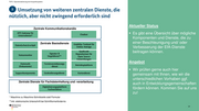 Aktueller Status Legende: Implementiert und in In Umsetzung Konzeptionell in Betrieb Arbeit Alle notwendigen Dienste sind Kommunikationskanäle entweder implementiert und in Zentrale Basisdienste für Bund und Länder Betrieb, gerade in Umsetzung oder werden konzeptionell behandelt. Dienste für Interoperabilität Angebot Kontaktieren Sie uns! Gemeinsam prüfen wir mit Ihnen, inwiefern wir mit den vorhandenen Konjunkturmitteln unterstützen Fachdatenhaltung und -verarbeitung können. *Zentrale Anwendungen, die dezentral (Bund und Länder) betrieben werden