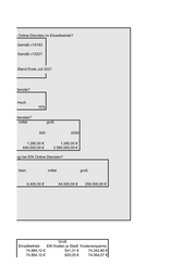 lassischen Online-Dienstes im Einzelbetrieb? Gemäß v15183 Gemäß v15221 Stand Ende Juli 2021 A Online-Dienste? Hoch 10% A Online-Dienstes? mittel groß 500 2000 1.280,00 € 1.280,00 € 640.000,00 € 2.560.000,00 € rentwicklung) bei EfA Online-Diensten? klein mittel groß 6.400,00 € 64.000,00 € 256.000,00 € Groß Einzelbetrieb EfA Kosten je Stadt Kostenersparnis 74.884,12 € 541,31 € 74.342,80 € 74.884,12 € 820,05 € 74.064,07 €