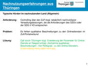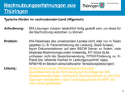 Nachnutzungserfahrungen aus Thüringen Typische Hürden im nachnutzenden Land (Allgemein) Anforderung: EfA-Lösungen müssen tatsächlich fertig gestellt sein, um diese für die Nachnutzung verproben zu können Problem: EfA-Readiness des umsetzenden Landes nicht oder nur in Teilen gegeben (z. B. Parametrisierung der Leistung, SaaS-Ansatz), kaum Dokumentationen auf dem BSCW Server zu finden, viele bilaterale Abstimmungsrunden notwendig, FIT-Store SLAs umfassen nicht die Gesamtanwendung, FITKO-Förderung vs. K- Paket (tlw. fehlende Klarheit im Leistungszuschnitt, bspw. NRW/HB im Bereich wirtschaftsnaher Verwaltungsleistungen) Lösung: Konkretisierung der EfA-Mindestanforderungen, Qualitätssicherung der EfA-Lösung auf Grundlage der EfA- Mindestanforderungen, technische Dokumentationen zu den EfA- Lösungen bereitstellen, klarer Leistungszuschnitt für MVP und volle Leistungsfähigkeit 2