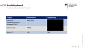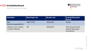 Architekturboard Stand der Arbeitspakete AP Nr. Arbeitspaket Zuständig Status 1. Parametrisierung SH/ BMI Abgeschlossen. Das Dokument "Orientierung Parametrisierung" ist in Version 1.0 verabschiedet worden und wurde veröffentlicht. Aktuell wird ein Workshop organisiert, um die sich aus dem Dokument ergebenden konkreten Änderungsanforderungen mit den zuständigen Produktmanagern zu diskutieren und zu planen. 2. Architekturrichtlinien FITKO Abgeschlossen. Die strategischen Architekturrichtlinien wurden in der Version 0.95 verabschiedet und veröffentlicht. Es ist geplant, die Richtlinien als Grundsatzdokument dem IT-Planungsrat in der Herbstsitzung zur Kenntnis und zum Beschluss vorzulegen. 3. Priorisierung der AP NI Abgeschlossen. 4. Verhältnis (EfA-) HB AP wird im AB nicht mehr aktiv verfolgt, sondern im Rechtsgremium. Aktivitäten werden Onlinedienst und verfolgt und an dieser Stelle bei Bedarf dokumentiert. Ziel ist es, die Schnittstellen Behörde zwischen rechtlichen und technischen Anforderungen dauerhaft zu managen. Passives AP. Digitalisierungsbudget 5. Rollen und Aufgaben des BMI/ FITKO Abgeschlossen. Dokument wurde veröffentlicht. AB in Projekten & Produkten 6. Informationskanäle/ AP wurde niedriger zugunsten der APe 1-5 priorisiert. Ein Kommunikationsplan ist Kommunikationsplan BMI/ FITKO seitens BMI/ FITKO in Bearbeitung. Plan soll spätestens im Rahmen der nächsten Sitzung des Boards beschlossen werden. S. 2
