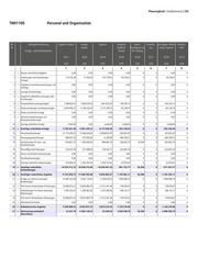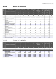 Planvergleich | Stadtkämmerei | 153 THH1100 Personal und Organisation lfd. Teilergebnisrechnung Ergebnis Vorjahr Fortges. Ergebnis Vergleich Ergänz. Ermächt. Verfügbare Mittel Ermächt. Nr. Ansatz Ergebnis/ Festlegung im aus abzgl. Ergebnis nach Ertrags- und Aufwandsarten Ansatz HH-Vollzug 2017 2018 2018 2018 2018 2017 2018 2019 EUR EUR EUR EUR EUR EUR EUR EUR 1 2 3 4 5 6 7 8 1 + Steuern und ähnliche Abgaben 0,00 0,00 0,00 0,00 0 0 0,00 0 2 + Zuweisungen und Zuwendungen, 114.533,26 77.500,00 155.778,01 78.278,01 0 0 -78.278,01 0 Umlagen 3 + Aufgelöste Investitionszuwendungen und 0,00 0,00 0,00 0,00 0 0 0,00 0 -beiträge 4 + Sonstige Transfererträge 0,00 0,00 0,00 0,00 0 0 0,00 0 5 + Entgelte für öffentliche Leistungen oder 0,00 0,00 0,00 0,00 0 0 0,00 0 Einrichtungen 6 + Privatrechtliche Leistungsentgelte 1.789.833,57 1.695.679,32 1.841.873,45 146.194,13 0 0 -146.194,13 0 7 + Kostenerstattungen und Kostenumlagen 3.879.090,27 4.108.250,00 4.172.378,75 64.128,75 0 0 -64.128,75 0 8 + Zinsen und ähnliche Erträge 0,00 0,00 0,00 0,00 0 0 0,00 0 9 + Aktivierte Eigenleistungen und 0,00 0,00 0,00 0,00 0 0 0,00 0 Bestandsveränderungen 10 + Sonstige ordentliche Erträge 2.004,36 0,00 3.628,05 3.628,05 0 0 -3.628,05 0 11 = Anteilige ordentliche Erträge 5.785.461,46 5.881.429,32 6.173.658,26 292.228,94 0 0 -292.228,94 0 12 - Personalaufwendungen -12.719.297,61 -13.566.040,00 -13.858.872,97 -292.832,97 0 0 292.832,97 0 13 - Versorgungsaufwendungen -466.651,55 -473.000,00 -6.290,69 466.709,31 0 0 -466.709,31 0 14 - Aufwendungen für Sach- und -918.831,37 -1.295.000,00 -966.997,25 328.002,75 30.200 0 -297.802,75 0 Dienstleistungen 15 - Planmäßige Abschreibungen -103.927,39 -575.388,00 -149.542,71 425.845,29 0 0 -425.845,29 0 16 - Zinsen und ähnliche Aufwendungen 0,00 0,00 0,00 0,00 0 0 0,00 0 17 - Transferaufwendungen 0,00 0,00 0,00 0,00 0 0 0,00 0 18 - Sonstige ordentliche Aufwendungen -744.604,27 -1.020.787,00 -1.046.757,61 -25.970,61 0 0 25.970,61 0 19 = Anteilige ordentliche -14.953.312,19 -16.930.215,00 -16.028.461,23 901.753,77 30.200 0 -871.553,77 0 Aufwendungen 20 = Anteiliges ordentliches Ergebnis -9.167.850,73 -11.048.785,68 -9.854.802,97 1.193.982,71 30.200 0 -1.163.782,71 0 21 + Erträge aus internen Leistungen 10.495.423,99 9.362.120,00 11.256.819,25 1.894.699,25 0 0 -1.894.699,25 0 (Entlastungen) 22 + THH-interne Gemeinkosten-Entlastungen 10.696.874,22 10.833.684,79 11.012.361,46 178.676,67 0 0 -178.676,67 0 23 - Aufwendungen für interne Leistungen -1.295.325,47 -1.269.462,65 -1.437.585,82 -168.123,17 0 0 168.123,17 0 (Belastungen) 24 - THH-interne Gemeinkosten-Belastungen -10.696.874,22 -10.833.684,79 -11.012.361,46 -178.676,67 0 0 178.676,67 0 25 + Kalkulatorische Kosten 0,00 0,00 0,00 0,00 0 0 0,00 0 26 = Kalkulatorisches Ergebnis 9.200.098,52 8.092.657,35 9.819.233,43 1.726.576,08 0 0 -1.726.576,08 0 27 = Nettoressourcenbedarf/- 32.247,79 -2.956.128,33 -35.569,54 2.920.558,79 30.200 0 -2.890.358,79 0 überschüsse