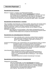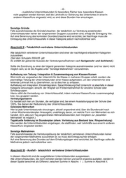 -5- Besondere Regelungen Besonderheiten der Grundschule Betreuer/-in, Erzieher/-in, Vertreter/-in der Religionsgemeinschaften: Dieses sind ”Nichtlehrkräfte” und damit nicht Bestandteil der Erhebung. Als Information kann ein Ausfall dieser Nichtlehrkräfte bzw. unter Pkt. II. der Ersatz einer Lehrkraft durch eine Nichtlehrkräften / der Einsatz von Lehrkräften als Vertretung von Nichtlehrkräften in den zutreffenden Spalten unter ”INFO” erfolgen. In keinem Fall ist in solchem Fall ein Eintrag unter Spalte ”Ausfall”. vorzunehmen. Besonderheiten der Sekundarstufe II - Kursphase Falls in Einzelfällen Unterrichtsstunden zur Vertretung anfallen, diese jedoch nicht vertreten werden, sondern die Schüler/-innen für diese Stunden z.B. Forschungsaufgaben erhalten; in der Schul- Bibliothek recherchieren, Projekte in der Schule vorbereiten und somit gleichfalls kein Unterrichtsausfall eintritt, dann sind die vertretenen Stunden unter der Kategorie ”Sonstige Maßnahmen” zu erfassen. ACHTUNG: Diese Regel gilt nur für die Kursphase. In allen anderen Jahrgangsstufen kann die ”Stillbeschäftigung”/ Aufgabenerteilung nicht als Unterrichtsvertretung gewertet werden. In solchem Fall führt dieses immer zu Ausweis als Unterrichtsausfall. Besonderheiten der sonderpädagogischen Förderzentren Ambulanzlehrer/-innen: Diese Lehrkräfte sind für Unterricht an anderen Schulen vorgesehen; sofern jedoch keine Anforderung erfolgt ist, stehen diese der eigenen Schule zum Einsatz zur Verfügung (bei Einsatz zur Vertretung ---> Pkt. II ...durch ”Vertretungsreserve ”) Krankheit der Ambulanzlehrer/-innen, Ambulanzlehrer/-innen mit sporadischem Einsatz an anderen Schulen: Grundsätzlich werden zur Vertretung anfallende Unterrichtsstunden, tatsächlich vertretene Unterrichtsstunden als auch ausgefallene Unterrichtsstunden immer an der Schule erfasst, an der dieses aufgetreten ist. . D.h. die Herkunft(Stammschule) der Lehrkraft ist unerheblich, entscheidend ist nur der ”Ausfall-/Einsatzort” der Lehrkraft. Unterrichtsausfall durch Teilnahme der Lehrkraft am Förderausschuss: Sofern Lehrkräfte durch Einsatz im Rahmen des Förderausschusses an anderen Schulen nicht ihren planmäßig vorgesehenen Unterricht erteilen können - d.h. Unterrichtsstunden fallen zur Vertretung an -, dann ist dieses unter Kategorie: ”dienstliche Abwesenheit & schulische Veranstaltungen” einzutragen. Besonderheiten der Schulen/Klassen für Geistigbehinderte Pädagogische Unterrichtshilfen: Diese sind ”Nichtlehrkräfte” und damit nicht Bestandteil der Erhebung. Um den besonderen Bedingungen der Schulen/Klassen für Geistigbehinderte gerecht zu werden, sind die durch Fehlen der PU zur Vertretung anfallenden Stunden und durch Lehrkräfte vertretene Stunden bzw. durch PU vertretene Unterrichtsstunden in einer gesonderten Spalte auszuweisen. (siehe Regelung ”Besonderheiten der Grundstufe”)