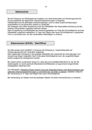 -6- Datenschutz Bei der Erfassung und Weitergabe der Angaben zum Unterrichtsausfall und Vertretungsunterricht sind grundsätzlich die allgemeinen Datenschutzbestimmungen zu beachten. Insbesondere sind die gefertigten Auswertungsbogen (und nur diese Zusammenfassungen) ausschließlich für die genannten Zwecke zu verwenden. Auf Verlangen kann diese Auswertung (nicht die Hilfstabellen) der Gesamtelternvertretung und den örtlichen Personalräten zugänglich gemacht werden. Nach Fertigstellung und Weitergabe der Auswertungstabellen am Ende des Schulhalbjahres sind alle Hilfstabellen umgehend (spätestens 14 Tage nach Beginn des neuen Schulhalbjahres) in geeigneter Form zu vernichten bzw. von den verwendeten Datenträgern zu löschen. Datenversion (EXCEL / StarOffice) Als Hilfe werden durch SenBWF 2 Versionen der Erhebung zu ”Unterrichtsausfall und Vertretungsunterricht der Lehrkräfte” angeboten. Nach tagaktueller Eintragung in die jeweilige Hilfstabelle wird maschinell die Verknüpfungen zum Auswertungs-Bogen hergestellt. Nach Ende jedes Schulhalbjahres kann der ausgefüllte Bogen jeweils ausgedruckt weitergereicht werden. Wir weisen jedoch ausdrücklich darauf hin, dass dies eine freiwillige Maßnahme ist, bei der die Dateneingabe nur durch geschulte Mitarbeiterinnen/Mitarbeiter an ergonomisch eingerichteten Arbeitsplätzen stattfinden darf. Die Hilfstabellen (Papierform/Datei-Version) sind nach Datenübermittlung unter Berücksichtigung der geltenden Datenschutzbestimmungen zu vernichten bzw. die Datei zu löschen. Spätester Zeitpunkt der Vernichtung ist 14 Tage nach Beginn des neuen Schulhalbjahres. Bei Verwendung von Dateien sind die jeweiligen Dateien mit einem Kennwortschutz zu versehen.