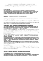 -5- Besondere Regelungen Besonderheiten der Grundschule Betreuer/-in, Erzieher/-in, Vertreter/-in der Religionsgemeinschaften: Dieses sind ”Nichtlehrkräfte” und damit nicht Bestandteil der Erhebung. Als Information kann ein Ausfall dieser Nichtlehrkräfte bzw. unter Pkt. II. der Ersatz einer Lehrkraft durch eine Nichtlehrkräften / der Einsatz von Lehrkräften als Vertretung von Nichtlehrkräften in den zutreffenden Spalten unter ”INFO” erfolgen. In keinem Fall ist in solchem Fall ein Eintrag unter Spalte ”Ausfall”. vorzunehmen. Besonderheiten der Sekundarstufe II - Kursphase Falls in Einzelfällen Unterrichtsstunden zur Vertretung anfallen, diese jedoch nicht vertreten werden, sondern die Schüler/-innen für diese Stunden z.B. Forschungsaufgaben erhalten; in der Schul- Bibliothek recherchieren, Projekte in der Schule vorbereiten und somit gleichfalls kein Unterrichtsausfall eintritt, dann sind die vertretenen Stunden unter der Kategorie ”Sonstige Maßnahmen” zu erfassen. ACHTUNG: Diese Regel gilt nur für die Kursphase. In allen anderen Jahrgangsstufen kann die ”Stillbeschäftigung”/ Aufgabenerteilung nicht als Unterrichtsvertretung gewertet werden. In solchem Fall führt dieses immer zu Ausweis als Unterrichtsausfall. Besonderheiten der sonderpädagogischen Förderzentren Ambulanzlehrer/-innen: Diese Lehrkräfte sind für Unterricht an anderen Schulen vorgesehen; sofern jedoch keine Anforderung erfolgt ist, stehen diese der eigenen Schule zum Einsatz zur Verfügung (bei Einsatz zur Vertretung ---> Pkt. II ...durch ”Vertretungsreserve”) Krankheit der Ambulanzlehrer/-innen, Ambulanzlehrer/-innen mit sporadischem Einsatz an anderen Schulen: Grundsätzlich werden zur Vertretung anfallende Unterrichtsstunden, tatsächlich vertretene Unterrichtsstunden als auch ausgefallene Unterrichtsstunden immer an der Schule erfasst, an der dieses aufgetreten ist. . D.h. die Herkunft(Stammschule) der Lehrkraft ist unerheblich, entscheidend ist nur der ”Ausfall-/Einsatzort” der Lehrkraft. Unterrichtsausfall durch Teilnahme der Lehrkraft am Feststellungsverfahren der sonderpädagogischen Förderung: Sofern Lehrkräfte durch Einsatz im Rahmen der Feststellungsverfahren an anderen Schulen nicht ihren planmäßig vorgesehenen Unterricht erteilen können - d.h. Unterrichtsstunden fallen zur Vertretung an -, dann ist dieses unter Kategorie: ”dienstliche Abwesenheit & schulische Veranstaltungen” einzutragen. Besonderheiten der Schulen/Klassen für Geistigbehinderte Pädagogische Unterrichtshilfen: Diese sind ”Nichtlehrkräfte” und damit nicht Bestandteil der Erhebung. Um den besonderen Bedingungen der Schulen/Klassen für Geistigbehinderte gerecht zu werden, sind die durch Fehlen der PU zur Vertretung anfallenden Stunden und durch Lehrkräfte vertretene Stunden bzw. durch PU vertretene Unterrichtsstunden in einer gesonderten Spalte auszuweisen. (siehe Regelung ”Besonderheiten der Grundstufe”)