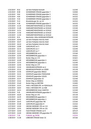 1/28/2019 9:28 Am Schroteanger 141312 1/28/2019 9:35 MARIENBORNER STRASSE vor 13 112402 1/28/2019 9:39 MARIENBORNER STRASSE vor 11 112402 1/28/2019 9:43 MARIENBORNER STRASSE vor 7 112402 1/28/2019 10:23 EGGERSDORFER STRASSE Ecke felgeleber str 112272 1/28/2019 15:40 Am Polderdeich Ecke Einfahrt Medoch 141322 1/28/2019 15:55 NACHTWEIDE Höhe 41 141312 1/28/2019 14:32 GUTSMUTHSWEG Höhe 17 141322 1/28/2019 14:32 GUTSMUTHSWEG Höhe 17 141322 1/28/2019 14:54 Bahrendorfer Str. Ecke HESEKIELSTRASSE 141312 1/28/2019 14:56 Bahrendorfer Str. Ecke Hesekiel 112262 1/28/2019 19:00 KIRCHHOFSTRASSE gegenüber 5 141312 1/28/2019 19:20 HALBERSTÄDTER STR. vor 164 112402 1/28/2019 15:23 RENNEBOGEN 141015 1/28/2019 15:25 RENNEBOGEN 141015 1/28/2019 10:30 Brückstr. 141312 1/28/2019 10:30 Brückstr. 141312 1/28/2019 10:56 Brückstr. 141312 1/28/2019 8:52 auf dem Parkplatz Jakobstr./Kirche 113140 1/28/2019 8:58 auf dem Parkplatz Jakobstr./Kirche 113140 1/28/2019 9:13 JULIUS-BREMER- STR. vor 8 113140 1/28/2019 9:27 MARGARETHENSTRASSE Höhe EDEKA 113140 1/28/2019 9:30 MARGARETHENSTRASSE neben SchulE 113140 1/28/2019 9:33 MARGARETHENSTRASSE neben SchulE 113140 1/28/2019 9:35 MARGARETHENSTRASSE neben SchulE 113140 1/28/2019 9:38 MARGARETHENSTRASSE Ecke WEITLINGSTRASSE 113140 1/28/2019 9:48 auf dem Parkplatz Große Steinernetischstr. 113150 1/28/2019 9:51 auf dem Parkplatz Große Steinernetischstr. 113140 1/28/2019 9:57 Breiter Weg vor 40 113140 1/28/2019 10:33 WEITLINGSTRASSE Ecke GROSSESTEINERNETISCHSTR 113140 1/28/2019 10:35 WEITLINGSTRASSE gegenüber 11 141392 1/28/2019 10:45 JULIUS-BREMER- STR. Höhe WEITLINGSTRASSE 113140 1/28/2019 10:50 auf dem Parkplatz Bei der Hauptwache 113140 1/28/2019 11:00 Alter Markt vor SONNENKLAR 113240 1/28/2019 11:08 ERNST-REUTER-ALLEE vor AUGAPFEL 112402 1/28/2019 11:12 Bei der Hauptwache gegenüber IHK 112372 1/28/2019 13:20 GROSSE KLOSTERSTR. vor KLOSTER 141324 1/28/2019 14:32 GROSSE KLOSTERSTR. neben KLOSTER 141322 1/28/2019 14:34 GROSSE KLOSTERSTR. neben KLOSTER 141322 1/28/2019 14:49 Breiter Weg vor 192 141118 1/28/2019 14:57 KRÜGERBRÜCKE gegenüber 6 113140 1/28/2019 15:06 ULRICHPLATZ gegenüber 9 113140 1/28/2019 15:11 KRÜGERBRÜCKE vor 2 113140 1/28/2019 13:09 auf dem Parkplatz hinter dem Justizzentrum 113123 1/28/2019 14:01 auf dem Parkplatz hinter dem Justizzentrum 113122 1/28/2019 13:41 HEYDECKSTRASSE gegenüber MUSEUM 113123 1/28/2019 15:48 HAECKELSTRASSE gegenüber 5 113140 1/28/2019 13:14 HAECKELSTRASSE gegenüber 5 113123