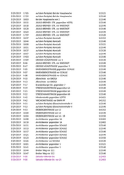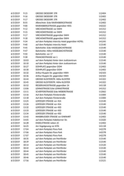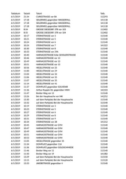 6/3/2019 9:15 GROSSE DIESDORF. STR 112404 6/3/2019 9:16 GROSSE DIESDORF. STR 112402 6/3/2019 9:17 GROSSE DIESDORF. STR 112402 6/3/2019 8:55 Albrechtstr. Ecke RAVENSBERGSTRASSE 112402 6/3/2019 9:00 RAVENSBERGSTRASSE gegenüber HDG 142222 6/3/2019 9:12 VIRCHOWSTRASSE vor SWM 141312 6/3/2019 9:15 VIRCHOWSTRASSE vor SWM 141312 6/3/2019 9:17 VIRCHOWSTRASSE gegenüber SWM 141312 6/3/2019 9:18 VIRCHOWSTRASSE gegenüber SWM 141312 6/3/2019 9:34 auf dem Parkplatz Intercity Hotel gegenüber HOTEL 141245 6/3/2019 9:40 auf dem Parkplatz Intercity Hotel 113140 6/3/2019 9:45 Bahnhofstr. Ecke HASSELBACHSTRASSE 113140 6/3/2019 9:47 Bahnhofstr. Höhe HASSELBACHSTRASSE 113140 6/3/2019 9:50 Bahnhofstr. vor 17 113140 6/3/2019 9:58 FRANCKESTRASSE vor 1 113140 6/3/2019 10:03 auf dem Parkplatz hinter dem Justizzentrum 113140 6/3/2019 10:10 auf dem Parkplatz hinter dem Justizzentrum 113140 6/3/2019 10:27 DOMPLATZ gegenüber DOM 112402 6/3/2019 10:30 DOMPLATZ gegenüber DOM 112402 6/3/2019 10:32 Arthur-Ruppin-Str. gegenüber HWH 142103 6/3/2019 10:36 Arthur-Ruppin-Str. gegenüber HWH 142103 6/3/2019 10:44 GROSSE KLOSTERSTR. Höhe KLOSTER 141322 6/3/2019 10:45 GROSSE KLOSTERSTR. Höhe KLOSTER 141322 6/3/2019 10:52 REGIERUNGSSTRASSE gegenüber 24 141118 6/3/2019 13:06 LENNéSTRASSE Ecke LENNéSTRASSE 141312 6/3/2019 13:11 SCHÄFFERSTRASSE Ecke WEBERSTRASSE 112062 6/3/2019 13:16 Auf dem Parkplatz Försterstraße 113300 6/3/2019 13:18 Auf dem Parkplatz Försterstraße 113300 6/3/2019 13:25 LEIPZIGER STRASSE vor 45A 113140 6/3/2019 13:26 LEIPZIGER STRASSE vor 45A 113140 6/3/2019 13:32 LEIPZIGER STRASSE vor 45D 113140 6/3/2019 13:33 LEIPZIGER STRASSE vor 45D 113140 6/3/2019 13:34 LEIPZIGER STRASSE vor 45D 113140 6/3/2019 13:42 INNSBRUCKER STRASSE vor EINFAHRT 112402 6/3/2019 14:05 auf dem Parkplatz Hakeborner Str. 113320 6/3/2019 16:28 ENDELSTRASSE neben 2C 112402 6/3/2019 16:25 Am Vogelgesang vor KITA 141118 6/3/2019 17:04 auf dem Parkplatz Flora Park 142278 6/3/2019 17:06 auf dem Parkplatz Flora Park 142278 6/3/2019 17:07 auf dem Parkplatz Flora Park 142278 6/3/2019 18:35 auf dem Parkplatz am Petriförder 113140 6/3/2019 18:39 auf dem Parkplatz am Petriförder 113140 6/3/2019 18:14 auf dem Parkplatz am Petriförder 113120 6/3/2019 18:42 auf dem Parkplatz am Petriförder 113140 6/3/2019 18:44 auf dem Parkplatz am Petriförder 113140 6/3/2019 18:45 auf dem Parkplatz am Petriförder 113140 6/3/2019 18:46 auf dem Parkplatz am Petriförder 113140 6/3/2019 17:56 auf dem Parkplatz am Petriförder 113121