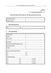 Nr. 2 - Tag der Ausgabe: Erfurt, den 28. Februar 2020 81 Anlage4 (zu § 8 Abs. 3) Vertraulich behandeln Probezeitbeurteilung Beurteilende Behörde: Personal-Nummer: 1. Beurteilungszeitraum VOM bis 11. Personalangaben Diese An aben werden von der ersonalverwaltenden Stelle aus efüllt! Familienname Vorname Geburtsdatum Dienststelle Amtsbezeichnung/Besoldungsgruppe, seit Organisationseinheit Funktion Zeitraum einer Schwerbehinderung vom bis vom bis Teilzeitbeschäftigung vom bis Umfang VOM bis Umfang VOM bis Umfang