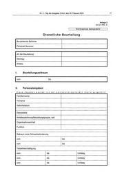 Nr. 2 - Tag der Ausgabe: Erfurt, den 28. Februar 2020 71 Anlage 2 (zu § 8 Abs. 3) Vertraulich behandeln Dienstliche Beurteilung Beurteilende Behörde: Personal-Nummer: Art der Beurteilung: Stichtag: Anlass: 1. Beurteilungszeitraum VOM bis 11. Personalangaben Diese Angaben werden von der personalverwaltenden Stelle aus nefüllt! Familienname Vorname Geburtsdatum Dienststelle Amtsbezeichnung/Besoldungsgruppe, seit Organisationseinheit Funktion Zeitraum einer Schwerbehinderung vom bis vom bis Teilzeitbeschäftigung vom bis Umfang vom bis Umfang vom bis Umfang