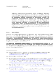 Wissenschaftliche Dienste Ausarbeitung Seite 304 WD 2 - 3000 - 062/21 Afghanistan pakistanische Unterstützung gegen gewalttätigen Militanten, insbesondere gegen die in Afghanistan aktiven Gruppen zu erhalten. Dennoch ist der Aufstand in Afghanistan überwiegend afghanisch. Indem die Regierung der Islamischen Republik Afghanistan die Bevölkerung verteidigt, die subnationale Regierungsführung verbessert und entrechteten ländlichen Gemeinden eine Stimme in der Regierung gibt, kann die Regierung der Islamischen Republik Afghanistan – mit Unterstützung der ISAF – Afghanistan sowohl gegen das Eindringen von inländischen als auch ausländischen Aufständischen stärken. Die Wiedereingliederung von Gemeinschaften und Einzelpersonen in das politische System kann dazu beitragen, die Virulenz des Aufstandes so weit zu reduzieren, dass sie keine existenzielle Bedrohung mehr 1146 1147 für die Regierung darstellt.“ 8.1.15.5. Saudi-Arabien Zwar hat Saudi-Arabien keine Grenze zu Afghanistan, aber Riad hinterlässt einen großen Fussabdruck im Konflikt. Die afghanische Bevölkerung besteht zu 99,9 Prozent aus Muslimen. Davon sind etwa 80 Prozent Sunniten und 20 Prozent Schiiten. Riad finanziert sunnitisch- wahhabistisch geprägte Madressen (Koranschulen), in Pakistan, in denen Taliban ausgebildet werden, seit Jahrzehnten mit Geldzuwendung und Leistungen und gilt als eine der zuverlässigsten 1148 1149 Hauptfinanzierungsquellen für die Taliban. Die Haupt- und Staatsreligion Saudi-Arabiens (33,5 Millionen Einwohner, darunter ca. 11,5 Millionen ausländischer Herkunft) ist der sunnitische Islam in seiner wahhabitischen Prägung, dem über 70 Prozent der Bevölkerung angehören. Hinzu kommen über zehn Prozent Sunniten aus 1150 anderen Glaubensgemeinschaften. 1146 In: General McChrystal’s report on Afghanistan and external influences, Bill Roggio, 21 September 2009, Long War Journal, abgerufen am 27. November 2021 unter https://www.longwarjournal.org/archi- ves/2009/09/general_mccrystals_report_on_a.php 1147 Übersetzung durch den Autor dieser Arbeit. 1148 Der Islam in Afghanistan, Abbas Poya, 22. November 2012, Bundeszentrale für politische Bildung, abgerufen am 2. Januar 2022 unter https://www.bpb.de/internationales/asien/afghanistan-das-zweite-gesicht/149603/der-is- lam-in-afghanistan ; Afghanistan, Der Beauftragte der Bundesregierung für weltweite Religionsfreiheit, Bundes- ministerium für wirtschaftliche Zusammenarbeit und Entwicklung, undatiert, abgerufen am 2. Januar 2022 unter https://religionsfreiheit.bmz.de/de/der-bericht/laender-A-Z/afghanistan/index.html 1149 WikiLeaks cables portray Saudi Arabia as a cash machine for terrorists, Declan Walsh, The Guardian, 5. Dezember 2010, abgerufen am 2. Januar 2022 unter https://www.theguardian.com/world/2010/dec/05/wikil- eaks-cables-saudi-terrorist-funding 1150 Saudi-Arabien, Der Beauftragte der Bundesregierung für weltweite Religionsfreiheit, Bundesministerium für wirtschaftliche Zusammenarbeit und Entwicklung, undatiert, abgerufen am 2. Januar 2022 unter https://religi- onsfreiheit.bmz.de/de/der-bericht/laender-A-Z/saudi-Arabien/index.html