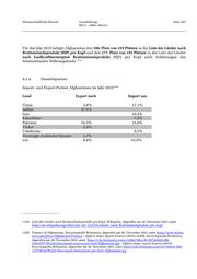 Wissenschaftliche Dienste Ausarbeitung Seite 307 WD 2 - 3000 - 062/21 Für das Jahr 2019 belegte Afghanistan den 188. Platz von 193 Plätzen in der Liste der Länder nach Bruttoinlandsprodukt (BIP) pro Kopf und den 177. Platz von 193 Plätzen in der Liste der Länder nach kaufkraftbereinigtem Bruttoinlandsprodukt (BIP) pro Kopf nach Schätzungen des 1159 Internationalen Währungsfonds. 8.2.4. Handelspartner 1160 Import- und Export-Partner Afghanistans im Jahr 2019 Land Export nach Import aus China 3,6% 17,1% Indien 47,5% Iran 18,4% Kasachstan 7,6% Pakistan 34,5% 15,6% Türkei 2,9% Usbekistan 6,3% Vereinigte Arabische Emirate 2,7% n/n 8,8% 35,0% 1159 Liste der Länder nach Bruttoinlandsprodukt pro Kopf, Wikipedia, abgerufen am 24. November 2021 unter https://de.wikipedia.org/wiki/Liste_der_L%C3%A4nder_nach_Bruttoinlandsprodukt_pro_Kopf 1160 Finance of Afghanistan, Encyclopaedia Britannica, abgerufen am 28. November 2021 unter https://www.britan- nica.com/place/Afghanistan/Finance ; Afghan major import Sources (2019), Grafik, Encyclopaedia Britannica, abgerufen am 28. November 2021 unter https://cdn.britannica.com/s:1500x700,q:85/20/183820-004- 59831FE7/World-Data-import-sources-pie-chart-Afghanistan.jpg ; Afghan major export Sources (2019), Encyclopaedia Britannica, abgerufen am 28. November 2021 unter https://cdn.britannica.com/21/183821-050- A37C9626/World-Data-export-destinations-pie-chart-Afghanistan.jpg