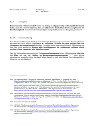 Wissenschaftliche Dienste Ausarbeitung Seite 308 WD 2 - 3000 - 062/21 8.2.5. Korruption Korruption und Vetternwirtschaft waren von Anfang an allgegenwärtig und maßgeblicher Grund dafür, dass die Kabuler Regierung bzw. der afghanische Zentralstaat kaum Akzeptanz in der 1161 Bevölkerung fand. Nachstehend werden lediglich einige Indikatoren und Beispiele genannt. 8.2.5.1. Gesamtschätzung Eine Studie des Wissenschaftlichen Dienstes des US-Kongresses (Congressional Research Service) aus dem Jahr 2011 schätzt, dass bis zu 4,5 Milliarden US-Dollar in einem einzigen Jahr aus Afghanistan herausgeschmuggelt werden. Laut einer Studie von Integrity Watch Afghanistan aus dem Jahr 2015 werden 65 Prozent aller Bargeldsummen, die Afghanistan verlassen, illegal 1162 verdient, illegal transferiert oder illegal verwendet. Laut der Nichtregierungsorganisation Transparency International belegt Afghanistan im Jahr 2020 1163 1164 den Platz 165 von 180 Ländern im Korruptionswahrnehmungsindex , eine leichte Verbesserung gegenüber 2011: das Land belegte damals – nach zehn Jahren Entwicklungshilfe – 1165 Platz 180 von 182 Ländern. 1161 Vgl. ergänzend dazu: Corruption in Afghanistan, Wikipedia, abgerufen am 31. Dezember 2021 unter https://en.wikipedia.org/wiki/Corruption_in_Afghanistan ; 12 Ways Your Tax Dollars Were Squandered in Afghanistan – SIGAR says the U.S. has spent $10 billion more reconstructing Afghanistan than at the end of World War II, 5. März 2016, NBC News, abgerufen am 31. Dezember 2021 unter https://www.nbcnews.com/news/world/12-ways-your-tax-dollars-were-squandered-afghanistan-n528771 ; Hundreds of billions were spent by the US in Afghanistan. Here are 10 of the starkest examples of 'waste, fraud and abuse', Nick Paton Walsh, 7. Oktober 2021, CNN, abgerufen am 31. Dezember 2021 unter https://edition.cnn.com/2021/10/07/asia/us-afghanistan-spending-waste-intl-cmd/index.html 1162 Hamid Karzai International Airport: Despite Improvements, Controls to Detect Cash Smuggling Still Need Strengthening, Office of Special Projects, Special Inspector General for Afghanistan Reconstruction (SIGAR), SIGAR 21-15-SP, 14. Januar 2021, S. 1, abgerufen am 17. November 2021 unter https://www.sigar.mil/pdf/spe- cial%20projects/SIGAR-21-15-SP.pdf 1163 Corruption Perceptions Index (CPI). 1164 CPI 2020: Tabellarische Rangliste, Transparency International Deutschland e.v., undatiert, abgerufen am 30. Dezember 2021 unter https://www.transparency.de/cpi/cpi-2020/cpi-2020-tabellarische-rangliste/ 1165 CPI 2011: Tabellarische Rangliste, Transparency International Deutschland e.v., undatiert, abgerufen am 30. Dezember 2021 unter https://www.transparency.de/fileadmin/Redaktion/Publikatio- nen/2011/2011_CPI_EN.pdf