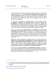 Wissenschaftliche Dienste Ausarbeitung Seite 312 WD 2 - 3000 - 062/21 Die berüchtigtsten ‚Investitionen‘ der Kabul Bank sind in Dubai, wo laut Ferozi [einem der Gründer, A.d.R.] 160 Millionen US-Dollar für 35 Luxusvillen auf der Palm Jumeirah ausgegeben wurden, den künstlichen Sandbänken, die in das Arabische Meer ragen. Viele der Häuser wurden auf Farnoods Namen [einen der beiden Gründer der Bank, A.d.R.] registriert und an andere Bankaktionäre vergeben. In einem der skandalösesten Kreditgeschäfte der Kabul Bank wurden 22 Millionen US-Dollar an Mahmoud Karzai, einen der Brüder des Präsidenten und ehemaligen Restaurantbesitzer aus Maryland, ausgezahlt. Mit diesem zinslosen Darlehen kaufte Karzai selbst Anteile an der Bank. Damit wurde der Bruder des Präsidenten der drittgrößte Aktionär der größten Bank des Landes, ohne einen Cent seines eigenen Geldes ausgegeben zu haben. Dann waren noch die vier Millionen Dollar an Bankgeldern, die für Karzais Wahlkampf 2009 geflossen sind. ‚Wir haben [die 4 Millionen Dollar] nicht umsonst gegeben‘, sagt (…) Ferozi. ‚Dafür haben wir 430.000 Regierungskonten bekommen und von diesen Konten hat die Bank einen Gewinn von 4 Millionen US-Dollar im Monat gemacht‘. Wenn wir es nicht getan hätten, wären andere Banken bereit gewesen, 20 Millionen US-Dollar zu geben, um die Konten zu bekommen.“ (…) Obwohl sie einige paschtunische Aktionäre hatte, war die Kabul Bank ein Eckpfeiler des tadschikischen Establishments im Norden Afghanistans, mit engen Verbindungen zu führenden Warlords, darunter Marschall Fahim, den Karzai – zum Entsetzen der Vereinten Nationen – 2009 zu seinem Vizepräsidenten ernannte. Fahims Bruder und seine Familie erhielten Kredite der Kabul Bank in Höhe von mindestens 78 Millionen US-Dollar (…) Ein forensisches Audit in Höhe von 10 US-Millionen US-Dollar, das teilweise vom britischen Ministerium für internationale Entwicklung bezahlt wird, sollte bei der Wiedererlangung von Vermögenswerten und bei der Strafverfolgung 1177 1178 1179 helfen, aber es ist bis dahin noch ein langer Weg.“ 1177 The financial scandal that broke Afghanistan's Kabul Bank, Jon Boone, 16. Juni 2011, The Guardian, abgerufen am 30. Dezember 2021 unter https://www.theguardian.com/world/2011/jun/16/kabul-bank-afghanistan-finan- cial-scandal 1178 Hervorhebungen durch den Autor dieser Arbeit. 1179 Übersetzung durch den Autor dieser Arbeit.