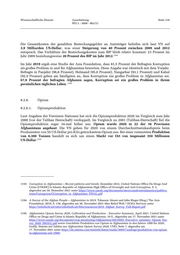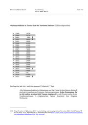 Wissenschaftliche Dienste Ausarbeitung Seite 317 WD 2 - 3000 - 062/21 Opiumproduktion in Tonnen laut den Vereinten Nationen (Zahlen abgerundet) 1990: 1.570t 2000: 3.270t 2001: 185t 2002: 3.400t 2003: 2.600t 2004: 4.200t 2005: 4.100t 2006: 5.300t 2007: 7.400t 2008: 5.900t 2009: 4.000t 2010: 3.600t 2011: 5.800t 2012: 3.700t 2013: 5.500t 2014: 6.400t 2015: 3.300t 2016: 4.800t 2017: 9:000t 2018: 6.400t 2019: k.A. 2020: 6.300t 2021: 6.800t 1196 Zur Lage im Jahr 2021 stellt der neueste VN-Bericht fest: „Die Opiumproduktion in Afghanistan und die Preise für den Heroin-Rohstoff sind nach Angaben der Vereinten Nationen gestiegen. In der Erntesaison, die im Juli endete, wurden 6800 Tonnen eingebracht – acht Prozent mehr als im Vorjahreszeitraum. (…)Afghanisches Opium dominiert den illegalen Weltmarkt. 1196 Drug Situation in Afghanistan 2021 – Latest findings and emerging threats, November 2021, United Nations Of- fice on Drugs, 24. S. abgerufen am 17. November 2021 unter https://www.unodc.org/documents/data-and-analy- sis/Afghanistan/Afghanistan_brief_Nov_2021.pdf