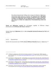 Wissenschaftliche Dienste Ausarbeitung Seite 318 WD 2 - 3000 - 062/21 Die militant-islamistischen Taliban, die im August die Macht in Afghanistan übernommen hatten, gelten als Profiteure des Drogengeschäfts. Mit Opium wurden laut UNDOC dieses Jahr zwischen 1,8 Milliarden und 2,7 Milliarden US-Dollar (1,6 Milliarden und 2,4 Milliarden Euro) in Afghanistan umge- setzt. Rund ein Zehntel der afghanischen Wirtschaftsleistung beruht auf 1197 Opium.“ Opium aus Afghanistan versorgt laut VN-Angaben ungefähr 25 Millionen Drogen- 1198 konsumenten (d.h. 80 Prozent aller Nutzer) weltweit. Darüber hinaus gilt Afghanistan 2021 als der zweitgrößte Haschisch-Produzent der Welt nach 1199 Marokko. 8.2.6.2. Opiumkonsum 1200 Im Jahr 2015 konsumieren laut UNODC 2 bis 2,5 Millionen Menschen Opium in Afghanistan. 1197 UN-Bericht: In Afghanistan wird wieder mehr Opium produziert, 17. November 2021, UNRIC, abgerufen am 18. November 2021 unter https://unric.org/de/afghanistan17112021/ (Hervorhebung durch den Redakteur dieser Arbeit). 1198 Drug Situation in Afghanistan 2021 – Latest findings and emerging threats, November 2021, United Nations Of- fice on Drugs, S. 14, abgerufen am 17. November 2021 unter https://www.unodc.org/documents/data-and-analy- sis/Afghanistan/Afghanistan_brief_Nov_2021.pdf 1199 Drug Situation in Afghanistan 2021 – Latest findings and emerging threats, November 2021, United Nations Of- fice on Drugs, S. 12, abgerufen am 17. November 2021 unter https://www.unodc.org/documents/data-and-analy- sis/Afghanistan/Afghanistan_brief_Nov_2021.pdf 1200 The situation – West and Central Asia, Office on Drugs and Crime, United Nations, undatiert, abgerufen am 20. September 2021 unter https://www.unodc.org/unodc/en/drug-trafficking/central-asia.html