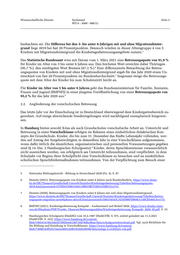 Wissenschaftliche Dienste Sachstand Seite 4 WD 8 - 3000 - 086/21 1. Einleitung Die erfolgreiche Teilnahme am Unterricht der Grundschule setzt eine gewisse persönliche, sozi- ale und kognitive Entwicklung des Kindes, insbesondere hinsichtlich des Erwerbs der deutschen 1 Sprache, voraus. Maßnahmen zur Gewährleistung gleicher Startchancen zum Zeitpunkt des Schuleintritts, wie etwa einer Kita-Pflicht im Vorschulalter, sind immer wieder Gegenstand poli- 2 tischer und gesellschaftlicher Diskussionen. Die Beauftragte der Bundesregierung für Migration, Flüchtlinge und Integration fordert in ihrem aktuellen Bericht bundesweit verpflichtende früh- zeitige Sprachstandserhebungen im Vorschulalter und eine ggf. anschließende verpflichtende 3 Sprachförderung. Dieser Sachstand geht der Frage nach, wie vor der Einschulung insbesondere sprachliche Defizite festgestellt und verpflichtende Fördermaßnahmen verfassungskonform ausgestaltet werden kön- nen. 2. Ausgangslage 2.1. Betreuungsquote im Vorschulalter Nach Angaben des Nationalen Bildungsberichts „Bildung in Deutschland 2020“ lag die Quote der Inanspruchnahme früher Bildung, Betreuung und Erziehung bei den 3- bis unter 6-Jährigen im Jahr 2019 erneut bei 93 %. Damit besuchten 9 von 10 Kindern ab 3 Jahren eine Einrichtung der Kindertagesbetreuung. Der leichte Rückgang seit 2015 - mit 95 % das Jahr mit dem bisheri- gen Höchststand - sei dabei auch vor dem Hintergrund der starken Zuwanderung in den Jahren 4 2015 und 2016 zu betrachten. Ein Vergleich der Bildungsbeteiligungsquoten von Kindern mit und ohne Migrationshintergrund ergebe, dass nach wie vor eine ungleiche Inanspruchnahme zu 1 Vgl. bspw. Niesel, Schulreife oder Schulfähigkeit – was ist darunter zu verstehen?, Bundeszentrale für politi- sche Bildung, https://www.bpb.de/gesellschaft/bildung/zukunft-bildung/250140/schulreife. 2 Im ifo Bildungsbarometers 2019 sprachen sich 67 % der Befragten für die Einführung einer Kindergartenpflicht ab dem Alter von vier Jahren aus. Grewenig/Kersten/Kugler/Lergetporer/Werner/Wößmann, Was die Deutschen über Bildungsungleichheit denken, ifo Schnelldienst 17/2019, https://www.ifo.de/DocDL/sd-2019-17-2019-09- 12_7.pdf, S. 33. Vgl. auch Forderung nach Kitapflicht in Berlin (2018), https://www.berlin.de/aktuelles/ber- lin/5483785-958092-forderung-nach-kitapflicht-ablehnung-im-.html. Kritisch etwa Spieß, Warum eine Kita- Pflicht im letzten Vorschuljahr nicht für bessere Pisa-Ergebnisse sorgt, DIW Wochenbericht 51+52/2019, https://www.diw.de/documents/publikationen/73/diw_01.c.701188.de/19-51.pdf, S. 978. 3 12. Bericht der Beauftragten der Bundesregierung für Migration, Flüchtlinge und Integration - Deutschland kann Integration: Potenziale fördern, Integration fordern, Zusammenhalt stärken. Drucks. 19/15740, https://dser- ver.bundestag.de/btd/19/157/1915740.pdf, S. 129. 4 Nationaler Bildungsbericht - Bildung in Deutschland 2020, Drucks. 19/24780, https://dserver.bundes- tag.de/btd/19/247/1924780.pdf, S. 86.