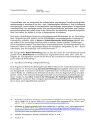 Wissenschaftliche Dienste Sachstand Seite 6 WD 8 - 3000 - 086/21 Vorschulklasse wird auf Antrag unter der Auflage befreit, eine geeignete Einrichtung der Kinder- tagesbetreuung zu besuchen (§ 28a Abs. 2 und 3 Hamburgisches Schulgesetz). Vom Schulbesuch zurückgestellte Kinder werden in eine bestehende Vorschulklasse aufgenommen. In begründeten Ausnahmefällen kann genehmigt werden, dass zurückgestellte Kinder stattdessen eine Kinderta- geseinrichtung besuchen, jedoch nicht in den Fällen einer Zurückstellung aufgrund der sprachli- chen Entwicklung des Kindes (§ 38 Abs. 3 Hamburgisches Schulgesetz). Noch nicht schulpflichtige Kinder mit sonderpädagogischem Förderbedarf, die zur Entwicklung ihrer Fähigkeiten auch im Hinblick auf die Schulfähigkeit sonderpädagogischer Anleitung und Unterstützung bedürfen, sollen in Bayern in Schulvorbereitenden Einrichtungen gefördert wer- den, sofern sie die notwendige Förderung nicht in anderen, außerschulischen Einrichtungen (z.B. Kindergärten) erhalten. Eine Betreuung in Schulvorbereitenden Einrichtungen kann in den letzten drei Jahren vor dem regelmäßigen Beginn der Schulpflicht erfolgen (Art. 22 Abs. 1 Bayeri- 10 sches Gesetz über das Erziehungs- und Unterrichtswesen). Das Schulgesetz für Baden-Württemberg sieht vor, dass für Kinder, die vom Schulbesuch zurück- gestellt werden, Förderklassen an Grundschulen eingerichtet werden sollen. Diese haben die Aufgabe, die zurückgestellten Kinder auf den Besuch der Grundschule vorzubereiten (§ 5a Schul- 11 gesetz für Baden-Württemberg). 2.3. Sprachstandserhebung und Sprachförderung Nach Angaben des Nationalen Bildungsberichts 2020 werden in den meisten Bundesländern ein bis zwei Jahre vor der Einschulung Sprachstandserhebungen durchgeführt. Unterschiede bestün- den dahingehend, ob landesweit alle Kinder verpflichtend oder nur bestimmte Gruppen - insbe- sondere Kinder mit nichtdeutscher Herkunft oder Kinder, die keine Tageseinrichtung besuchen - 12 getestet werden. Der Nationale Bildungsbericht 2020 weist auf repräsentative Erhebungen hin, denen zufolge bei etwa jedem 5. Kind in der Altersgruppe der 5-Jährigen ein Sprachförderbe- darf festgestellt worden sei. Eine verzögerte Sprachentwicklung betreffe auch 22 % der Kinder, 13 die zu Hause überwiegend Deutsch sprechen. 10 Bayerisches Gesetz über das Erziehungs- und Unterrichtswesen (BayEUG) in der Fassung der Bekanntmachung vom 31.5.2000 (GVBl. S. 414, 632, BayRS 2230-1-1-K), das zuletzt durch Gesetz vom 23.7.2021 (GVBl. S. 432) geändert worden ist, https://www.gesetze-bayern.de/Content/Document/BayEUG/true. 11 Schulgesetz für Baden-Württemberg (SchG) in der Fassung vom 1.8.1983 (GBl. S. 397), zuletzt geändert durch Gesetz vom 17.12.2020 (GBl. S. 1233), https://www.landesrecht-bw.de/jportal/portal/t/8ri/page/bsbawue- prod.psml?pid=Dokumentanzeige&showdoccase=1&js_peid=Trefferliste&fromdoctodoc=yes&doc.id=jlr-Schul- GBW1983V21G11&doc.part=X&doc.price=0.0#jlr-SchulGBW1983V14P5a. 12 Nationaler Bildungsbericht - Bildung in Deutschland 2020 (Fn. 4), S. 98. 13 Ebenda, S. 99.