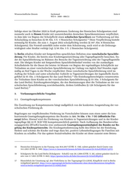 Wissenschaftliche Dienste Sachstand Seite 8 WD 8 - 3000 - 086/21 Infolge einer im Oktober 2020 in Kraft getretenen Änderung des Hessischen Schulgesetzes sind nunmehr auch in Hessen Kinder mit unzureichenden deutschen Sprachkenntnissen verpflichtet, in dem Jahr vor Beginn der Schulpflicht einen schulischen Sprachkurs zur Vorbereitung auf den 15 Schulanfang zu besuchen (§ 58 Abs. 5 S. 1 Hessisches Schulgesetz). Diese Verpflichtung besteht erstmalig für Kinder, die zum 1. August 2022 schulpflichtig werden (§ 187 Abs. 8 Hessisches Schulgesetz). Ein Verstoß unterfällt indes weder dem Schulzwang, noch wird er als Ordnungs- widrigkeit oder Straftat verfolgt (vgl. § 58 Abs. 5 S. 2 Hessisches Schulgesetz). In Berlin erhalten Kinder mit festgestellten sprachlichen Defiziten eine vorschulische Sprachför- derung. Für Kinder, die bereits eine Kindertageseinrichtung oder Tagespflegestelle besuchen, fin- det die Sprachförderung im Rahmen des Besuchs der Tageseinrichtung oder der Tagespflegestelle statt. Die übrigen Kinder mit festgestelltem Sprachförderbedarf werden von der zuständigen Schulbehörde für die Dauer der letzten 18 Monate vor Beginn der regelmäßigen Schulpflicht zur Teilnahme an einer vorschulischen Sprachförderung im Umfang von täglich fünf Stunden regel- mäßig an fünf Tagen in der Woche verpflichtet. Diese vorschulische Sprachförderung wird im Auftrag der Schule und unter schulischer Aufsicht in Tageseinrichtungen der Jugendhilfe durch- 16 geführt (§ 55 Abs. 2 Schulgesetz für das Land Berlin). Die Erziehungsberechtigten verantworten die Teilnahme ihres Kindes an der vorschulischen Sprachförderung (§ 55 Abs. 3 Schulgesetz für das Land Berlin). Erziehungsberechtigten, die den Bestimmungen über die Teilnahme an der vor- schulischen Sprachförderung zuwiderhandeln, drohen Geldbußen (§ 126 Schulgesetz für das 17 Land Berlin). 3. Verfassungsrechtliche Vorgaben 3.1. Gesetzgebungskompetenzen Die Zuordnung zur Kompetenznorm hängt maßgeblich von der konkreten Ausgestaltung der vor- schulischen Förderung ab. Regelungen zur verpflichtenden Förderung im Vorschulalter können zum einen unter die kon- kurrierende Gesetzgebungskompetenz des Bundes in Art. 74 Abs. 1 Nr. 7 GG (öffentliche Für- sorge) fallen. Hierauf wird die Förderung von Kindern in Tageseinrichtungen und in der Kinder- tagespflege (§§ 22 ff. SGB VIII) kompetenzrechtlich gestützt. Nach Auffassung des Bundesverfas- sungsgerichts (BVerfG) bestehe eine umfassende Gesetzgebungszuständigkeit des Bundes zur Re- gelung des Kindergartenrechts. Die Kindergartenbetreuung helfe den Eltern bei der Erziehung, fördere und schütze die Kinder und trage dazu bei, positive Lebensbedingungen für Familien mit Kindern zu schaffen. Für das spätere Sozialverhalten der Kinder sei diese zumeist erste Betreu- 15 Hessisches Schulgesetz in der Fassung vom 30.6.2017 (GVBl. S. 150), zuletzt geändert durch Gesetz vom 18.3.2021 (GVBl. S. 166), https://www.rv.hessenrecht.hessen.de/bshe/document/jlr-SchulGHE2017pIVZ. 16 Schulgesetz für das Land Berlin (Schulgesetz - SchulG) vom 26.1.2004 (GVBl. S. 26), zuletzt geändert durch Ge- setz vom 5.7.2021 (GVBl. S. 842), https://gesetze.berlin.de/bsbe/document/jlr-SchulGBEpELS. 17 Hinsichtlich der Umsetzung vgl. aber Vieth-Entus in: Der Tagesspiegel (5.4.2018), Kitapflicht wird in Berlin weitgehend ignoriert, https://www.tagesspiegel.de/berlin/erstklaessler-ohne-deutschkenntnisse-kitapflicht- wird-in-berlin-weitgehend-ignoriert/21142022.html.