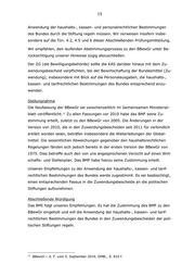 15 Anwendung der haushalts-, kassen- und personalrechtlichen Bestimmungen des Bundes durch die Stiftung regeln müssen. Wir verweisen insofern insbe- sondere auf die Tzn. 4.2, 4.5 und 6 dieser Abschließenden Prüfungsmitteilung. Wir empfahlen, den laufenden Abstimmungsprozess zu den BBewGr unter Be- rücksichtigung unserer Hinweise zügig abzuschließen. Der ZG (die Bewilligungsbehörde) sollte die KAS darüber hinaus mit dem Zu- wendungsbescheid verpflichten, bei der Bewirtschaftung der Bundesmittel (Zu- wendung), insbesondere mit Blick auf die Personalausgaben, die haushalts-, kassen- und tarifrechtlichen Bestimmungen des Bundes entsprechend anzu- wenden. Stellungnahme Die Neufassung der BBewGr sei zwischenzeitlich im Gemeinsamen Ministerial- blatt veröffentlicht. 11 Zu allen Fassungen vor 2010 habe das BMF seine Zu- stimmung erteilt, zuletzt zu den BBewGr von 2005. Die Änderungen in der Version von 2010, die in den Zuwendungsbescheiden seit 2011 für verbindlich erklärt worden seien, beträfen insbesondere die Weiterleitungen der Global- mittel. Die wesentlichen Abweichungen gegenüber den haushaltsrechtlichen Regelungen fänden sich jedoch bereits in der ersten Version der BBewGr von 1975. Dies betreffe auch den von uns angesprochenen Verzicht auf einen Wirt- schafts- und Stellenplan. Das BMF habe hierzu seine Zustimmung erteilt. Unseren Empfehlungen zu der Anwendung der haushalts-, kassen- und tarif- rechtlichen Bestimmungen des Bundes werde zugestimmt. Es sei beabsichtigt, einen entsprechenden Passus in die Zuwendungsbescheide an die politischen Stiftungen aufzunehmen. Abschließende Würdigung Das BMI folgt unseren Empfehlungen. Es hat die Zustimmung des BMF zu den BBewGr eingeholt und will die Anwendung der haushalts-, kassen- und tarif- rechtlichen Bestimmungen des Bundes in den Zuwendungsbescheiden der poli- tischen Stiftungen regeln. 11 BBewGr i. d. F. vom 5. September 2019, GMBl., S. 810 f.