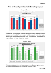 Tabelle 12 Anteil der Beschäftigten mit quotierter Beurteilungsrangstufe Frauen / Männer Der Anteil der Frauen mit einer quotierten Beurteilungsrangstufe liegt in der Gesamt- betrachtung mehr als 5%-Punkte unter dem der Männer und ist im Vergleich zu den jeweils letzten großen Beurteilungsrunden sogar zurückgegangen. Besonders im ge- hobenen Dienst wird dieser Unterschied deutlich. Vollzeit / Teilzeit Teilzeitbeschäftigte erhielten mit Ausnahme des höheren Dienstes signifikant selte- ner eine quotierte Beurteilung als Vollzeitkräfte (24,4% zu 41,3%). Seite 35 von 38