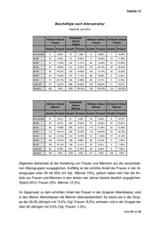 Tabelle 13 Beschäftigte nach Altersstruktur Stand 30. Juni 2014 Gehobener Höherer Dienst Mittlerer Dienst Einfacher Dienst Dienst Frauen Frauen Frauen Frauen Anzahl Prozent Anzahl Prozent Anzahl Prozent Anzahl Prozent 60 und älter 2 0,62% 15 1,39% 6 0,85% 7 5,26% 55-59 16 4,92% 72 6,65% 77 10,86% 15 11,28% 50-54 37 11,38% 122 11,27% 94 13,26% 37 27,82% 45-49 45 13,85% 161 14,87% 157 22,14% 39 29,32% 40-44 53 16,31% 158 14,59% 100 14,10% 16 12,03% 35-39 55 16,92% 127 11,73% 68 9,59% 3 2,26% 30-34 74 22,77% 162 14,96% 65 9,17% 5 3,76% unter 30 43 13,23% 266 24,56% 142 20,03% 11 8,27% Gesamt 325 100% 1083 100,00% 709 100,00% 133 100,00% Gehobener Höherer Dienst Mittlerer Dienst Einfacher Dienst Dienst Männer Männer Männer Männer Anzahl Prozent Anzahl Prozent Anzahl Prozent Anzahl Prozent 60 und älter 41 5,81% 61 3,93% 33 6,38% 9 8,57% 55-59 65 9,21% 202 13,02% 87 16,83% 25 23,81% 50-54 98 13,88% 205 13,21% 110 21,28% 23 21,90% 45-49 113 16,01% 245 15,79% 116 22,44% 19 18,10% 40-44 86 12,18% 214 13,79% 61 11,80% 17 16,19% 35-39 106 15,01% 138 8,89% 32 6,19% 2 1,90% 30-34 135 19,12% 146 9,41% 29 5,61% 2 1,90% unter 30 62 8,78% 341 21,97% 49 9,48% 8 7,62% Gesamt 706 100% 1552 100% 517 100% 105 100% Allgemein betrachtet ist die Verteilung von Frauen und Männern auf die verschiede- nen Altersgruppen ausgeglichen. Auffällig ist der erhöhte Anteil der Frauen in der Al- tersgruppe unter 30 mit 20% (im Vgl.: Männer 16%), jedoch haben sich hier die An- teile von Frauen und Männern in den letzten vier Jahren bereits deutlich angeglichen. (Stand 2010: Frauen 25%, Männer 12,3%). Im Gegensatz zu dem erhöhten Anteil der Frauen in der jüngeren Altersklasse, sind in den älteren Altersklassen die Männer überrepräsentiert. So waren sie in der Grup- pe der 55-59 Jährigen mit 13,2% (Vgl. Frauen: 8,0%) vertreten und in der Gruppe der über 60-Jährigen mit 5,0% (Vgl. Frauen: 1,3%). Seite 38 von 38