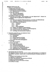 17712704 19:22 BMVG FUE S I 3 > +49 228 12 180931485 NUM433 DES Mögliche Themen des LKU 1. Individuum und Gesellschaft 1.1.Meine Werte und unsere Werte 1.2.Menschenbild und Menschenbilder 1.2.1. Menschenwürde ist unantastbar 1.3.Was heißt Toleranz? 1.3.1. Was heißt Nationalstolz? 1.3.2. Umgang mit Minderheiten 1.4. Einigkeit und Recht und Freiheit 1.5.Wie sehe ich den Staat? - Was erwartete ich von der Allgemeinheit? - Welche Ver- pflichtung habe ich gegenüber der Allgemeinheit? 1.6. Religion 1.6.1. Recht auf ungestörte Religionsausübung: zur Funktion der Militärseelsorge 1.6.2. Christliche Traditionen in der Bundesrepublik Deutschland 1.6.3, Einführung in die Weltreligionen 1.6.3.1. Christentum 1.6.3.2. Judentum 1.6.3.3. Islam 1.6.3.4. andere Weltreligion 1.6.4. Religion und religiöser Fundamentalismus 1.6.5. Christentum zwischen Toleranz und Selbstverleugnung 1.6.6. Krieg der Kulturen oder Globalisierung 1.6.7. Grundlagen des ökumenischen Gesprächs 2. Persönliche Lebensführung und soldatischer Dienst 2.1.Mensch/Familie und Beruf 2.1.1. Partnerschaft 2.1.2. Sexualität 2.1.3. Selbstverständnis als Soldat ‚2.1.4. Umgang mit Tod und Sterben 2.1.5. Sucht und andere Abhängigkeiten 2.2. Gewissen 2.2.1. Eid und Gelöbnis 2.3.Führen und Leiten 2.3.1. Befehl und Gehorsam 2.3.2. Führungsverantwortung 2.3.3. Führung und Kameradschaft 2.3.4. Umgang mit der Geschlechterdifferenz 2.3.5. Überbringen einer Todesnachricht 2.4.Das Selbstverständnis des Soldaten/der Soldatin 3. Herausforderungen des Einsatzes (Die folgenden Themen sind zwar auch für andere Lebenssituationen der Soldatinnen und Soldaten bedeutsam, werden aber im Zusammenhang des Einsatzes besonders vi- rulent.) 3.1. Reflexion des Einsatzes und seiner Ziele 3.2. Zugänge zur Friedensethik 3.3. Führen unter Belastung: Verantwortung und Schuld 3.4. Stress und Stressmanagement 3.5. Belastungen für Ehe und Familie im Einsatz 3.6. Konflikte im Einsatz