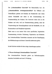 esru6rB4a 14:55 BMVG FUE S I 3 > +49 228 12 18931485 NUM1S1 2 Der „Lebenskundliche Unterricht“ für Mannschaften bzw. die „Lebenskundlichen Arbeitsgemeinschaften“ für Offiziere und Unteroffiziere gehören seit Bestehen der Bundeswehr zum Leben unserer Streitkräfte ‚und damit in den Zusammenhang der Gesamterziehung des Soldaten. Der Unterricht richtet sich an alle Soldaten und steht, weil zur Gesamterziehung gehörig, unter der Verantwortung des Generalinspekteurs und der Streitkräfte, d.h. der Kommandeure und Disziplinarvorgesetzten. Dabei muss es aus meiner Sicht einen spezifischen, begründeten Zusammenhang zwischen Zielsetzung, Organisation und Methoden des Lebenskundlichen Unterrichtes einerseits und der Beauftragung der Militärseelsorger mit diesem Unterricht andererseits geben. In drei Schritten möchte ich dazu einige Anmerkungen machen. 1. Warum überhaupt Lebenskundlicher Unterricht? _ Der Lebenskundliche Unterricht gehört zur Reformkonzeption deutscher Streitkräfte nach dem II. Weltkrieg. a2