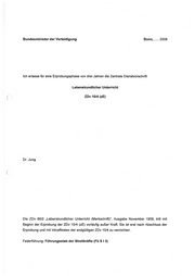 Bundesminister der Verteidigung Bonn, ..... 2008 Ich erlasse für eine Erprobungsphase von drei Jahren die Zentrale Dienstvorschrift Lebenskundlicher Unterricht ZDv 10/4 (zE) Dr. Jung Die ZDv 66/2 „Lebenskundlicher Unterricht (Merkschrift)“, Ausgabe November 1959, tritt mit Beginn der Erprobung der ZDv 10/4 (zE) vorläufig außer Kraft. Sie ist erst nach Abschluss der Erprobung und mit Inkrafttreten der endgültigen ZDv 10/4 zu vernichten. Federführung: Führungsstab der Streitkräfte (Fü S I 3)