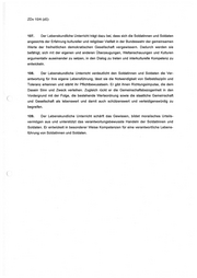 103, Es ist von entscheidender Bedeutung, dass die Soldatinnen und Soldaten in allen Gestaltungsfeldern der Inneren Führung (Anlage 1) diese leitenden Werte verinnerlichen und daraus ethische Kompetenz entwickeln. Unter ethischer Kompetenz ist die Befähigung der Soldatinnen und Soldaten zu verstehen, sich selbstbestimmt an den Werten und Normen des Grundgesetzes und den daraus resultierenden Werten und Normen des soldatischen Handelns zu orientieren und sie zur Richtschnur des gesamten Verhaltens als „Staatsbürger in Uniform“ zu machen. Hierfür ist ein soldatischer Wertekanon Richtschnur (Anlage 2). Der Lebens- kundliche Unterricht leistet bei der Entwicklung berufsethischer Kompetenz eine unver- zichtbare Ergänzung. In diesem Verständnis wirkt er auf die Persönlichkeitsbildung in den Bereichen „Individuum und Gesellschaft", „Persönliche Lebensführung und soldatischer Dienst" sowie „Moralische und psychische Herausforderungen des soldatischen Dienstes“ (Anlage 3). 104. Der Lebenskundliche Unterricht ist ein Ort freier und vertrauensvoller Aussprache und lebt von der engagierten Mitarbeit der Soldatinnen und Soldaten. Er ist kein Religionsunterricht und auch keine Form der Religionsausübung im Sinne von $ 36 des Soldatengesetzes, sondern eine berufsethische Qualifizierungsmaßnahme und damit verpflichtend. Er wird in der Regel von Militärseelsorgerinnen und Militärseelsorgern und im Bedarfsfall auch von anderen berufs- ethisch besonders qualifizierten! Lehrkräften erteilt. 105. Der Lebenskundliche Unterricht ist eine wichtige Ergänzung zu der von der Inneren Führung bestimmten Gesamtheit von Führung, Erziehung und Ausbildung in den Streitkräften. Er wird bei alien Truppenteilen und militärischen Dienststellen der Bundeswehr durchgeführt. Er wendet sich an alle Soldatinnen und Soldaten, unabhängig davon, ob sie einer bestimmten Glaubensgemeinschaft angehören oder nicht. Der Lebenskundliche Unterricht ist in die Lehrordnungen und Ausbildungspläne aufzunehmen und findet während der Dienstzeit statt. Il. Aufgaben und Ziele 106. Der Lebenskundliche Unterricht ist ein Beitrag zur weiteren Entwicklung der Persön- lichkeit der Soldatinnen und Soldaten. Er fördert damit die ethische Bildung und Werteorien- tierung, die wichtige Ziele der Inneren Führung sind (vgl. ZDv 10/1 „Innere Führung“, Nr. 105 ff., 507 f.). Er dient der Sinnvermittlung und befähigt die Soldatinnen und Soldaten, die ethische Dimension ihres Handelns zu erkennen, zu bedenken und zu bewerten. ' Als berufsethisch besonders qualifiziert gelten Lehrkräfte, die über eine entsprechende akademische Ausbildung verfügen (beispielsweise Religionswissenschaften, Philosophie, Psychologie, Rechtsphilo- sophie etc.) und die die Gewähr für die Qualität des Unterrichts bieten. Über Bedarf und Auswahl entscheidet das BMVg.