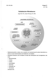 ZDv 10/4 (zE) Anlage 2/1 (Nr. 103) Soldatischer Wertekanon (Vgl. ZDv 10/1 „Innere Führung“, Nr. 507) SOLDATINNEN / SOLDATEN sind ... .. tapfer .. EU und MENSCHENWÜRDE gewissenhaft FREIHEIT ... moralisch urteilsfähig .. kameradschaftlich und fürsorglich DEMOKRATIE FRIEDEN ... gerecht, tolerant und aufgeschlossen gegenüber anderen Kulturen SOLIDARITÄT GERECHTIGKEIT GLEICHHEIT ... diszipliniert ... fachlich befähigt ... wahrhaftig und lernwillig gegenüber sicht und anderen - Selbstverantwortlich zu leben und zu handeln und Verantwortung für andere übernehmen zu können, ist eine Kernkompetenz der Soldatinnen und Soldaten. - Moralische Richtschnur des Verhaltens ist dabei das Wertesystem des Grundgesetzes, das durch + Menschenwürde, + Freiheit, Frieden, Gerechtigkeit, Gleichheit, Solidarität und Demokratie + +++ + verkörpert wird.
