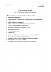 ZDv 10/4 (zE) Anlage 3 (Nrn. 103, 206) Curriculum der Inhalte zum Erreichen ethischer Kompetenz Folgende Themenfelder sind verbindlich im Lebenskundlichen Unterricht: 1. 1.1 1.2 1.3 1.4 1.5 2.1 2.2 2.3 3.1 3.2 3.3 3.4 Individuum und Gesellschaft Unser Menschenbild in Einklang mit dem Grundgesetz sowie andere Menschenbilder Identität und Toleranz Freiheit, Gewissen und Verantwortung Religion in Staat und Gesellschaft der Bundesrepublik Deutschland Religion in Staat und Gesellschaft anderer Länder Persönliche Lebensführung und soldatischer Dienst Mensch/Familie und Dienst Verantwortung übernehmen Leben und Tod Moralische und psychische Herausforderungen des soldatischen Dienstes Einführung in Kultur und Religionen/Ethos Weltreligionen Zugänge zur Friedens- und Konfliktethik aus dem europäischen Wertekanon Einsatzbelastung: Verantwortung und Schuld Umgang mit Konflikten, belastenden Situationen und Extremsituationen