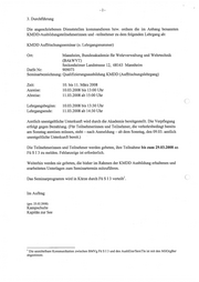 3. Durchführung Die angeschriebenen Dienststellen kommandieren bzw. ordnen die im Anhang benannten KMDD-Ausbildungsteilnehmerinnen und -teilnehmer zu dem folgenden Lehrgang ab: KMDD Auffrischungsseminar (0. Lehrgangsnummer) Ort: Mannheim, Bundesakademie für Wehrverwaltung und Wehrtechnik (BAkWVT) Seckenheimer Landstrasse 12, 68163 Mannheim DstSt Nr: 909073 Seminarbezeichnung: Qualifizierungsausbildung KMDD (Auffrischungslehrgang) Zeit: 10. bis 11. März 2008 Anreise: 10.03.2008 bis 13:00 Uhr Abreise: 11.03.2008 ab 15:00 Uhr Lehrgangsbeginn: 10.03.2008 bis 13:30 Uhr Lehrgangsende: 11.03.2008 ab 14:30 Uhr Amtlich unentgeltliche Unterkunft wird durch die Akademie bereitgestellt. Die Verpflegung erfolgt gegen Bezahlung. (Für Teilnehmerinnen und Teilnehmer, die verkehrsbedingt bereits am Sonntag anreisen müssen, steht - nach Anmeldung — ab dem Sonntag, den 09.03. amtlich unentgeltliche Unterkunft bereit.) Die Teilnehmerinnen und Teilnehmer werden gebeten, ihre Teilnahme bis zum 29.03.2008 an Fü SI3 zu melden. Fehlanzeige ist erforderlich. Weiterhin werden sie gebeten, die bisher im Rahmen der KMDD Ausbildung erhaltenen und erarbeiteten Unterlagen zum Seminartermin mitzuführen. Das Seminarprogramm wird in Kürze durch FüSI3 verteilt. Im Auftrag (gez. 25.02.2008) Kampschulte Kapitän zur See ! Die unmittelbare Kommunikation zwischen BMVg Fü SI3 und den AusbEinr/SemTiIn ist mit den MilOrgBer abgestimmt.