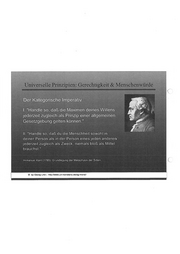 Der Kategorische Imperativ I. "Handle so, daß die Maximen deines Willens jederzeit zugleich als Prinzip einer allgemeinen Gesetzgebung gelten können." Il. "Handle so, daß du die Menschheit sowohl in deiner Person als in der Person eines jeden anderen jederzeit zugleich als Zweck, niemals bloß als Mittel brauchst." Immanuel Kant (1785): Grundlegung der Metaphysik der Sitten. © by Georg Lind | http://www.uni-konstanz.de/ag-moral/