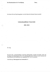 Der Bundesminister der Verteidigung Bonn, Ich erlasse für eine Erprobungsphase von drei Jahren die Zentrale Dienstvorschrift Lebenskundlicher Unterricht ZDv 10/4 Dr. Jung Die ZDv 66/2 „Lebenskundlicher Unterricht (Merkschrift)‘“ Ausgabe November 1959, tritt mit Beginn der Erprobung der ZDv 10/4 vorläufig außer Kraft. Sie ist erst nach Abschluss der Erprobung und mit Inkrafttreten der endgültigen ZDv 10/4 zu vernichten. Federführung: Führungsstab der Streitkräfte 13