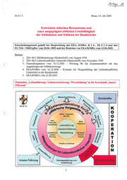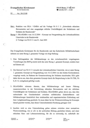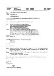 IV ‚Evangelisches Kirchenamt 53115 Bonn, 27.06.2005 für die Bundeswehr ® (0228) 947 — 2168 Az.: 36-15-06 Betr.: Reaktion von EKA / KMBA auf die Vorlage Fü S I 3: „Entwickeln ethischen Bewusstseins und eine ausgeprägte sittliche Urteilsfähigkeit der Soldatinnen und Soldaten der Bundeswehr“ Bezug: 1. EKA/KMBA vom 16.12.2004 — Konzept zur Neugestaltung des Lebenskundlichen Unterrichts in der Bundeswehr 2: Vorlage von Fü SI3 vom 01. Juni 2005 Das Evangelische Kirchenamt für die Bundeswehr und das Katholische Militärbischofsamt nehmen zur unter Bezug 2. genannten Vorlage wie folgt Stellung: . Eine Stellungnahme der Militärseelsorge zu den zwischenzeitlich vorgetragenen Vorstellungen des BMVg ersetzt nicht das unter Bezug 1. genannte Konzept, sondern baut auf diesem auf. Der Entwurf von Fü S 13 versucht den Lebenskundlichen Unterricht, wie er unter Bezug 1. genannten. Konzept zur Neugestaltung vom 16.12.2004 von den beiden Kirchenämtern vorgelegt wurde, im Rahmen der Gesamterziehung der Soldaten einzubinden. EKA geht daher davon aus, dass eben genanntes Konzept durch die Besprechung in den Fü TSK, Fü S, RI4, weitgehend gebilligt wurde. . EKA/KMBA stimmen überein, dass Militärseelsorge und Innere Führung zusammenwirken in der Entwicklung ethischen Bewusstseins und der sittlichen Urteilsfähigkeit der Soldatinnen und Soldaten. EKA/KMBA gehen davon aus, dass dies unbeschadet der Geschiedenheit zwischen militärischen Einheitsführern und Militärseelsorger hinsichtlich ihrer strukturellen und organisatorischen Einbindung und ihrer Aufgabenstellung geschieht. Es muss daher bei der Weiterentwicklung der Konzepte darauf geachtet werden, dass dieser Unterschiedenheit Rechnung getragen wird Insofern wird es eine Unterscheidung geben müssen zwischen einer normativen Wertevermittlung, wie er z.B. in der politischen Bildung geschehen könnte, und einer ethischen Sinn- und Lebensorientierung, für die es notwendig ist, außerhalb der Postanschrift Vermittlung Post Vermittlung Bw Telefax Argelanderstr. 105 0228/947-0 3430 - 88 0228 / 947 2185 Dokument]