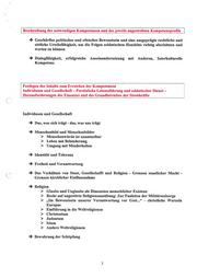 Beschreibung der notwendigen Kompetenzen und des jeweils angestrebten Kompetenzprofils | > Geschärftes politisches und ethisches Bewusstsein und eine ausgeprägte rechtliche und sittliche Urteilsfähigkeit, um die Folgen soldatischen Handelns richtig abschätzen und werten zu können > Dialogfähigkeit, erfolgreiche Auseinandersetzung mit Anderen, Interkulturelle Kompetenz Festlegen der Inhalte zum Erreichen der Kompetenzen Individuum und Gesellschaft — Persönliche Lebensführung und soldatischer Dienst — Herausforderungen des Einsatzes und des Grundbetriebes der Streitkräfte Individuum und Gesellschaft > Das, was sich trägt - das, was uns trägt > Menschenbild und Menschenbilder > Menschenwürde ist unantastbar > Leben mit Behinderung > Umgang mit Minderheiten > Identität und Toleranz > Freiheit und Verantwortung > Das Verhältnis von Staat, Gesellschafft und Religion - Grenzen staatlicher Macht - Grenzen kirchlicher Einflussnahme > Religion Glaube und Unglaube als Dimension menschlicher Existenz Recht auf ungestörte Religionsausübung: Zur Funktion der Militärseelsorge „Im Bewusstsein unserer Verantwortung vor Gott...“ - christliche Wurzeln Europas Einführung in die Weltreligionen Christentum Judentum Islam Andere Weltreligionen VVVVWV VVW > Bewahrung der Schöpfung